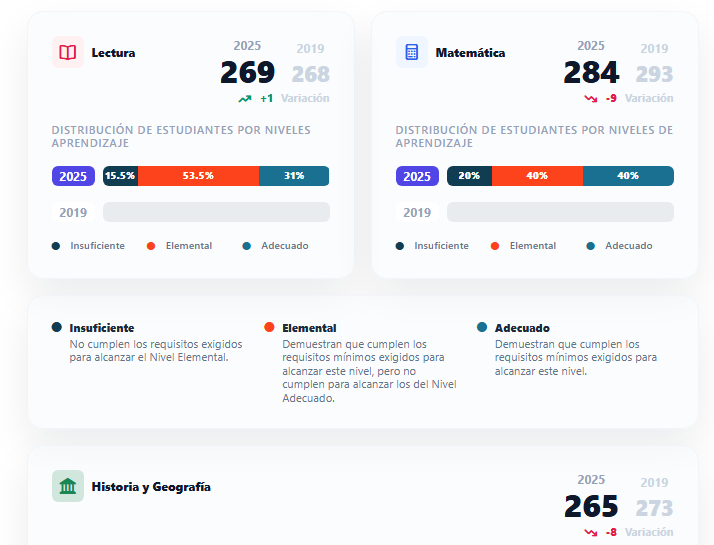 Bajo este parámetro, se registra una baja de 9 puntos en Matemática, de 293 a 284, y una baja de 8 puntos en Historia, Geografía y Ciencias Sociales, de 273 a 265.