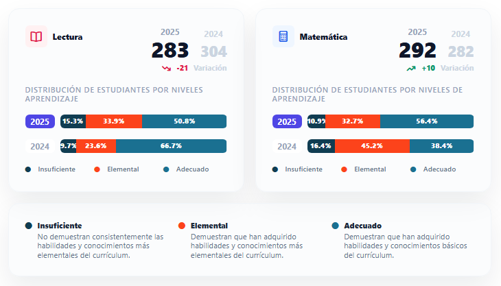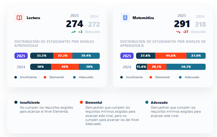 La preocupación técnica aquí no es solo el puntaje, sino la dificultad del establecimiento para mover a más estudiantes desde un aprendizaje elemental hacia uno sólido y transferible.