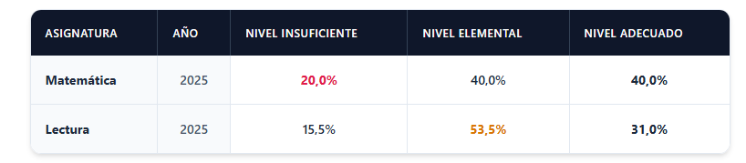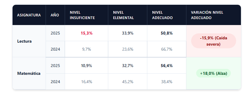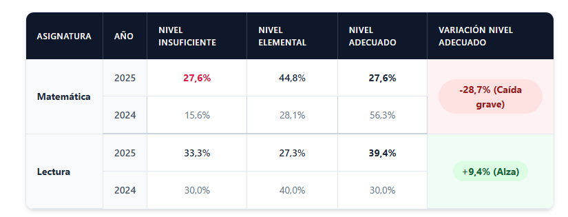 La gravedad del dato no radica solo en la baja del promedio, sino también en el cambio de composición del aprendizaje: en Matemática II Medio, el porcentaje de estudiantes en nivel adecuado cayó de 56,3% en 2024 a 27,6% en 2025, mientras el nivel insuficiente subió de 15,6% a 27,6%.